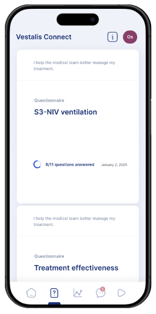 Using the Vestalis Connect4 mobile app, patients can complete certain questionnaires directly, including the S3-NIV. This is a short PROM (11 items) designed for the daily monitoring of patients undergoing non-invasive ventilation (NIV). The S3-NIV measures symptoms, sleep, and side effects: leaks, mask comfort, “too much air,” dryness, and patient-ventilator synchronization. These are valuable indicators for detecting patients at risk of discontinuing treatment and adjusting settings.